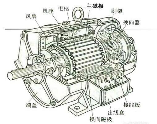 直流電機(jī)的結(jié)構(gòu)多種多樣,但原理相同。定子上總有一對(duì)直流勵(lì)磁的靜止的主磁極N和S,在旋轉(zhuǎn)部分轉(zhuǎn)子上安裝有電樞鐵芯。線圈的首和尾分別連接到兩個(gè)圓弧形的銅片上,即換向片,換向片之間是絕緣的。當(dāng)電樞轉(zhuǎn)動(dòng)時(shí),電樞線圈通過(guò)換向片和電刷與外電路接通。